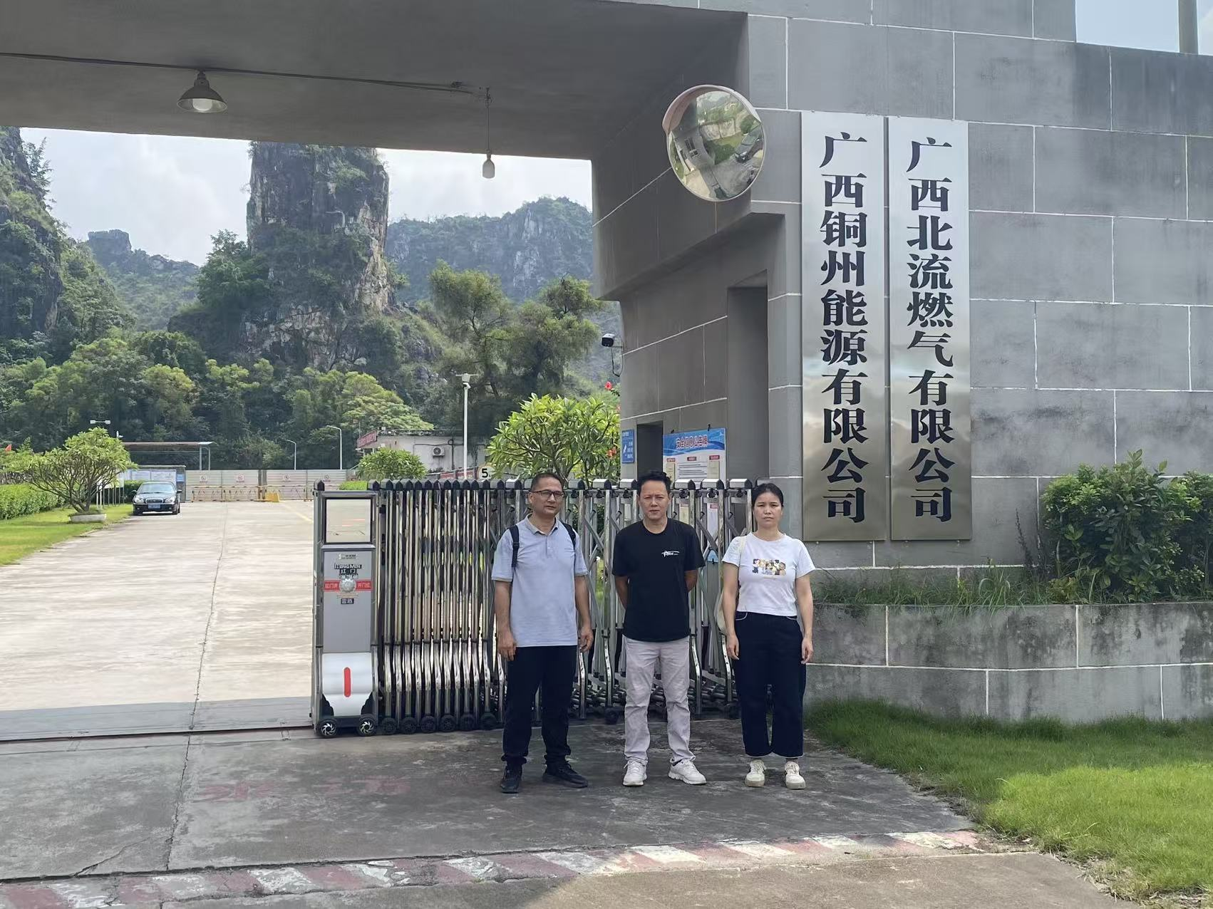 评价师覃英忠()、黄麒珊()和企业代表(中)在厂区大门