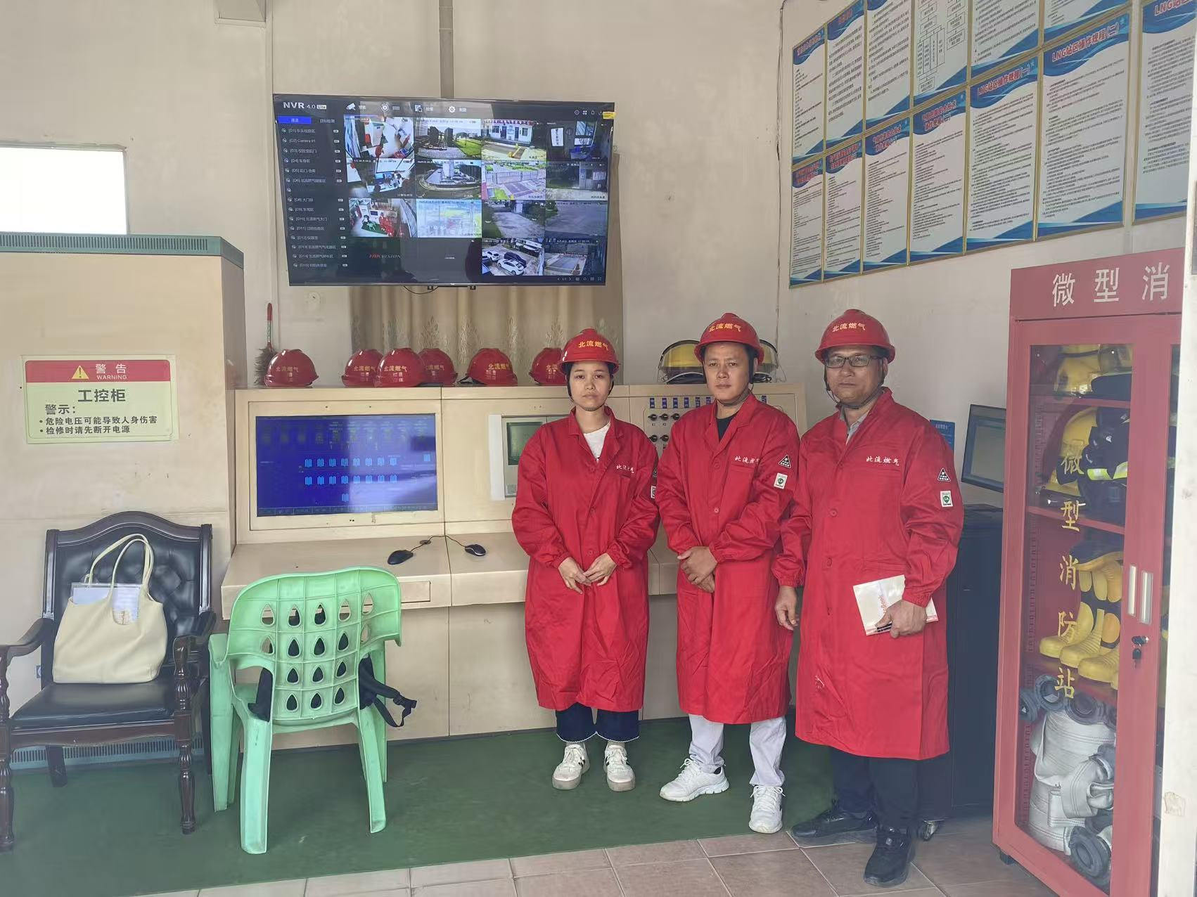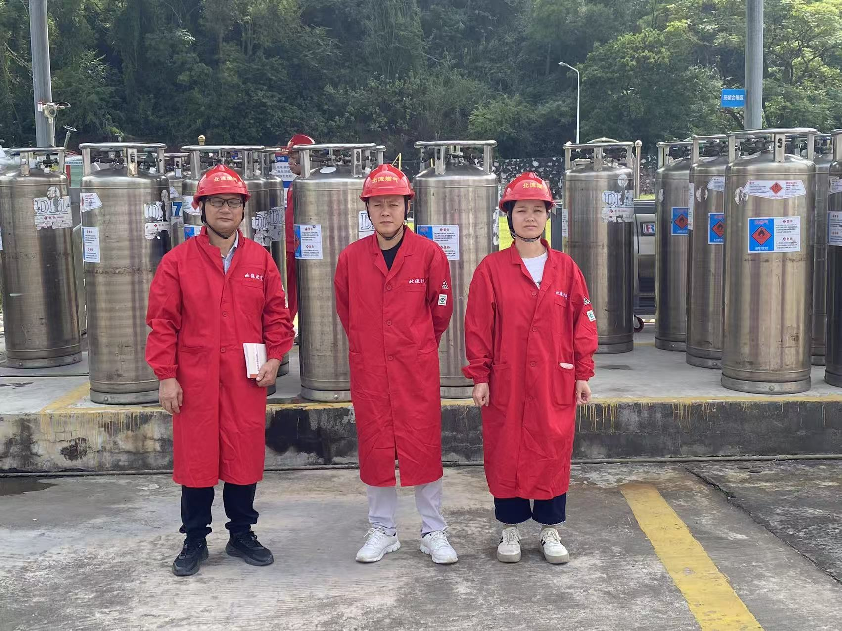 评价师覃英忠(左)、黄麒珊(右)和企业代表(中)在LNG储罐区